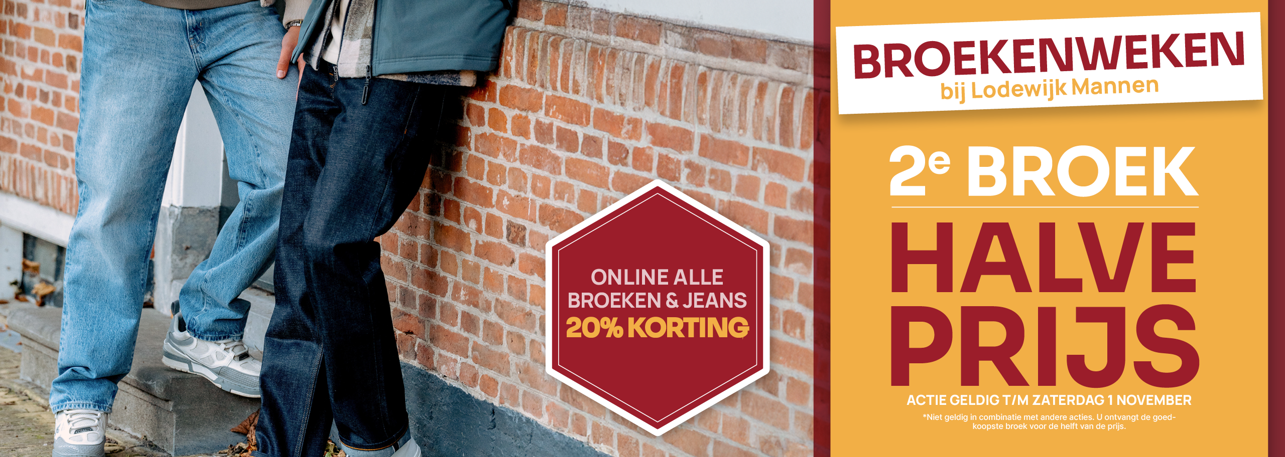In de winkel profiteer je van de 2e broek voor de halve prijs, en online ontvang je 20% korting op alle broeken.