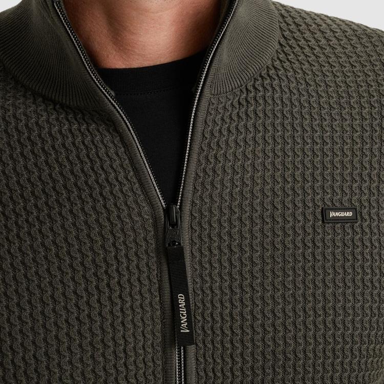 Dit groene herenvest van Vanguard presenteert zich met een fijne gestructureerde breistof en eigentijdse opstaande kraag. De volledige ritsluiting aan de voorkant zorgt voor praktisch draaggemak, terwijl het kleine merklogo op de borst een subtiel detail vormt. De geribde afwerking aan mouwen en zoom geeft dit najaarsessential een verzorgde uitstraling. Een veelzijdig kledingstuk dat moeiteloos past in de moderne herengarderobe.