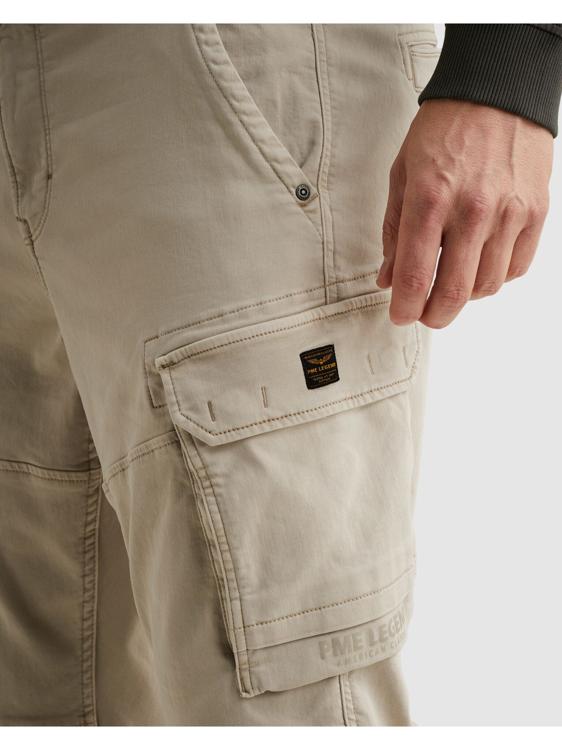 Deze cargobroek van PME Legend combineert een stoere uitstraling met functioneel design. De broek heeft een rechte pasvorm en is uitgevoerd in een beige kleur met een lichte wassing. Aan beide zijkanten zitten ruime cargozakken met klep en drukknoop, ideaal voor het meenemen van kleine spullen. De broek sluit met een knoop en rits, en heeft klassieke steekzakken aan de voorzijde en kleppenzakken aan de achterzijde. Het stoere karakter wordt versterkt door de kenmerkende PME Legend details.