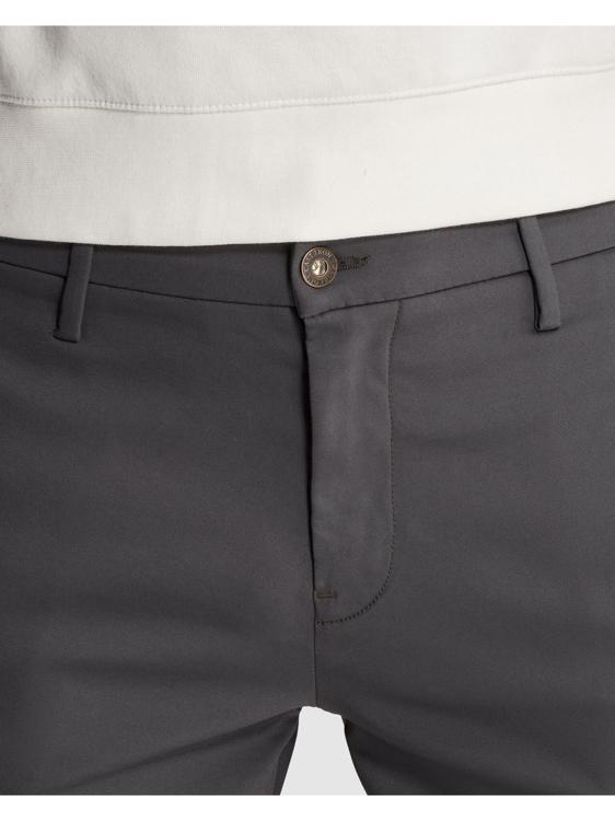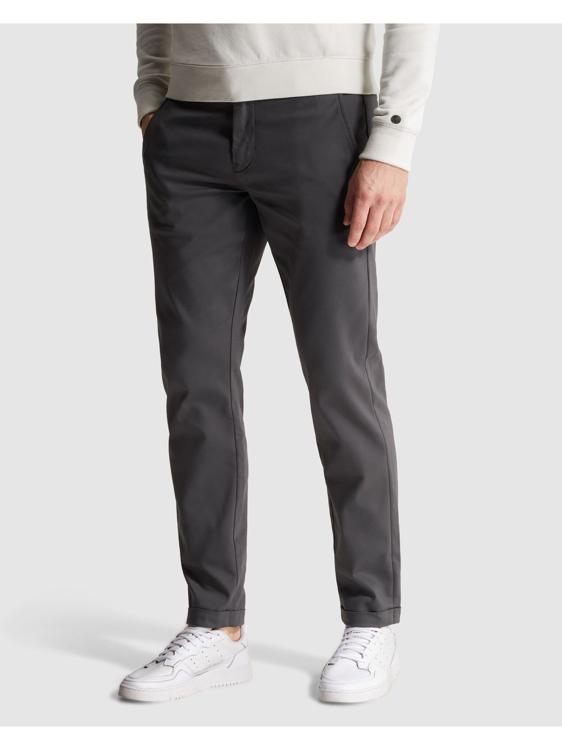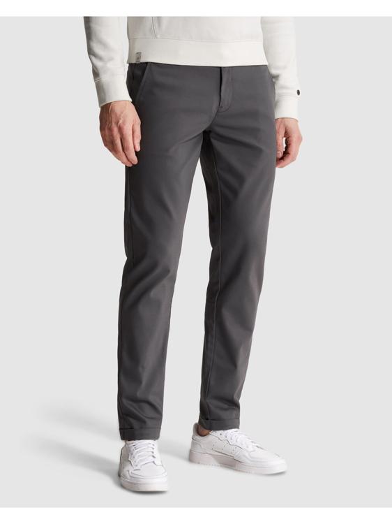 Deze grijze chino van Cast Iron combineert een strakke snit met functionele details. De broek heeft een klassieke ritssluiting met knoopsluiting en is voorzien van steekzakken aan de voorzijde en paspelzakken aan de achterzijde. Het model kenmerkt zich door een rechte pijp met een moderne, slanke pasvorm. De donkergrijze tint maakt de pantalon veelzijdig inzetbaar. Een heren broek die zowel zakelijk als casual gedragen kan worden, geschikt voor het zomerseizoen.