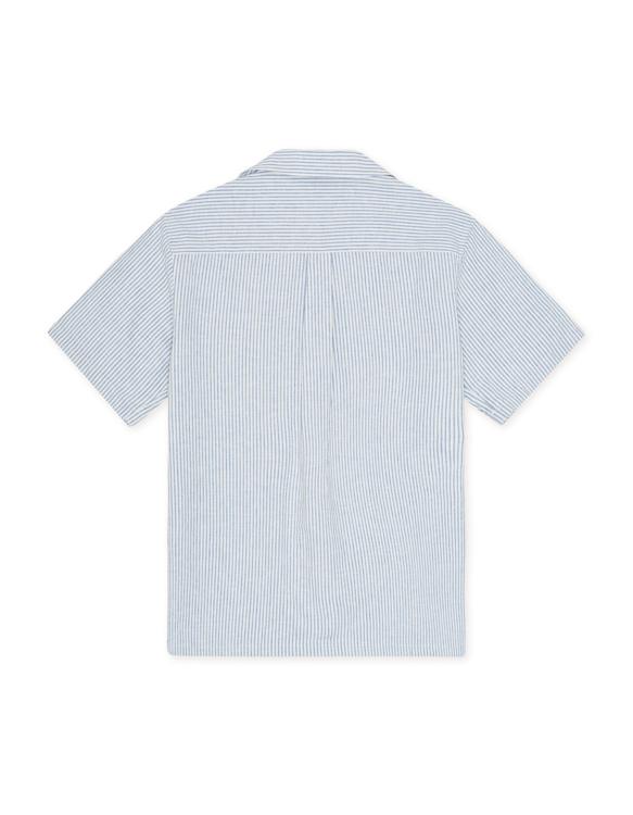 Dit blauwe overhemd van Les Deux combineert een lichtblauwe en witte streepstructuur met een relaxed fit. Het shirt heeft korte mouwen, een opvallende reverskraag en een knoopsluiting aan de voorzijde. De mix van katoen en linnen zorgt voor een luchtige draag en natuurlijke textuur, ideaal voor warme dagen. Het model heeft een boxy silhouet met wat extra volume in de schouders en torso. De lichte kleurschakering en fijne streep geven dit heren overhemd een frisse zomerse uitstraling, zonder dat het basic aanvoelt.
