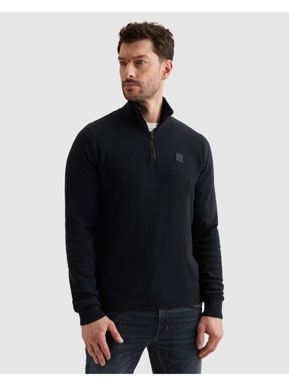 Deze herensweater met korte rits heeft een staande kraag en een ritssluiting tot halverwege de borst. De donkerblauwe trui is voorzien van een subtiele structuur in de brei en een klein vierkant logolabel op de borst. Het design is clean en stoer, met egale mouwen en een strakke boordafwerking aan de zoom, kraag en manchetten. De sweater combineert casual looks met praktische functionaliteit door de ritssluiting.