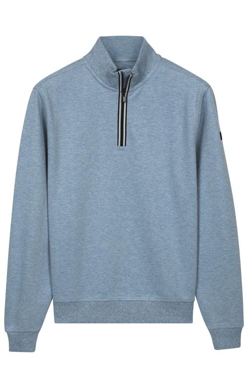 Deze blauwe trui van Baileys combineert een sportieve uitstraling met een verzorgde look. De staande kraag met korte rits geeft het sweater karakter en maakt het een veelzijdig kledingstuk. De gemêleerde structuur voegt visuele diepte toe aan het ontwerp. De mix van katoen en polyester zorgt voor draagcomfort én vormvastheid, waardoor de trui makkelijk in onderhoud blijft. De ribgebreide manchetten en zoom geven een nette afwerking. Een betrouwbare heren trui die goed combineert met verschillende outfits.