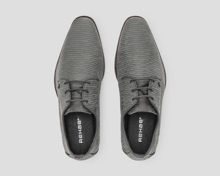 Deze grijze lage schoenen combineren uitstekend met een donkere chino en een casual overhemd voor een smart casual outfit. Ook onder een nette jeans met polo maken ze een strakke indruk. De gestructureerde uitstraling maakt deze schoenen veelzijdig genoeg voor zowel zakelijke als ontspannen gelegenheden. Rehab staat bekend om ontwerpen die stijl en comfort samenbrengen.