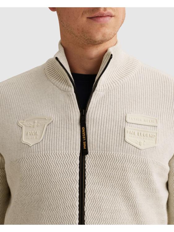 Dit gebreide heren vest van PME Legend heeft een doorlopende ritssluiting en staat kraag. Aan de voorzijde zitten twee borstzakken met klepdetail. De afwerking is degelijk, met ribboord aan de zoom en manchetten. De beige/off-white kleur maakt dit cardigan veelzijdig te dragen. Het vest is uitgevoerd in een effen structuur en voorzien van een klein merklabel op de mouw.