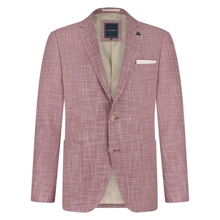 Dit rode colbert van Scotland Blue combineert een klassiek geruite structuur met een moderne zomerse uitstraling. De blazer heeft een lichtgewicht samenstelling die het hele seizoen comfortabel draagt en kreukarm blijft. Het jasje is voorzien van een gestructureerde kraag, twee knoopsluiting en borstzakje met pochette. De gespreide zakken aan de voorzijde en binnenzak bieden praktische opbergruimte. Het contrasterende crèmekleurige voering zorgt voor een afgewerkte look.