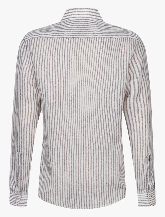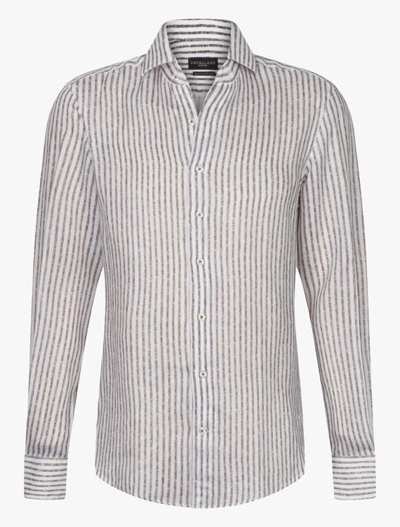 Dit bruine gestreepte overhemd van Cavallaro Napoli combineert een klassiek streepdessin met een luchtige stofmix die perfect is voor de zomer. De verticale strepen in bruin en wit zorgen voor een strakke uitstraling, terwijl de mix van linnen en lyocell het shirt ademend en comfortabel maakt. Het overhemd heeft een reguliere kraag, lange mouwen en sluit met knoopsluiting aan de voorzijde. De natuurlijke kreukeffect van het materiaal geeft het een relaxte, maar toch verzorgde look. De klassieke snit maakt dit heren overhemd veelzijdig inzetbaar.
