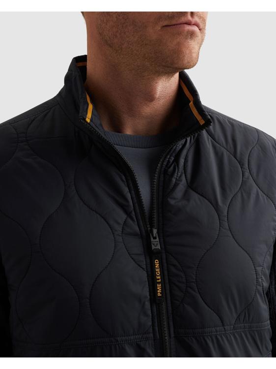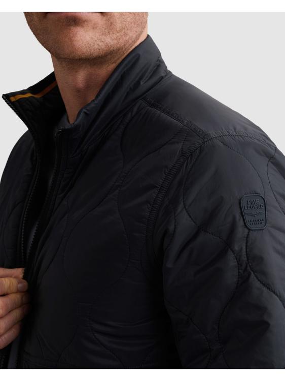 Deze blauwe bomberjack van PME Legend combineert een sportieve silhouet met praktische details. Het jack heeft een opstaande kraag en sluit met een ritssluiting aan de voorzijde. De voorkant en achterkant zijn voorzien van een ruitvormig gestikt patroon dat zorgt voor extra textuur en een stoere uitstraling. De mouwen zijn glad afgewerkt met gebreide boorden aan de onderkant, net zoals de zoom en de kraagrand. Aan de zijkanten zitten steekzakken met ritssluiting. Het jack heeft een klassieke bomberfit met elastische details, ideaal voor heren die zoeken naar een jassenlaag voor het tussenseizoen.