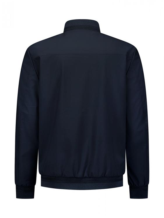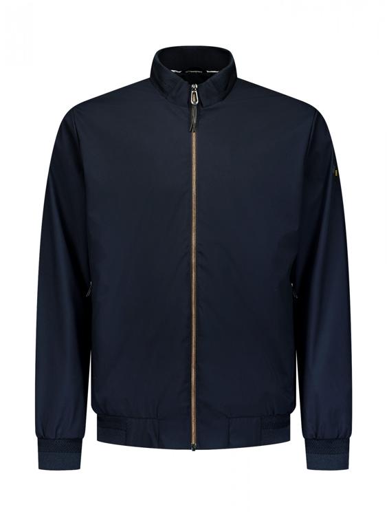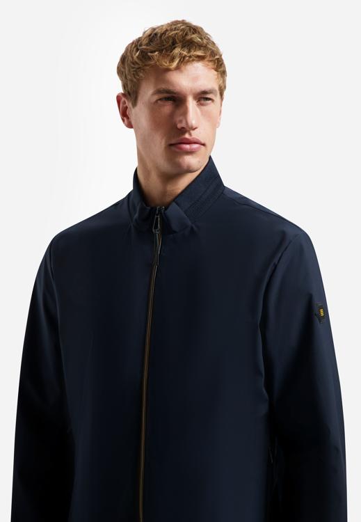 Deze donkerblauwe herenjas van No Excess combineert een strakke, clean uitstraling met het soepele draagcomfort van een licht rekbare stof. De jack valt slim en gestructureerd zonder te knellen, ideaal voor een actieve dag op het werk of in het weekend. Met een opstaande kraag, een rits aan de voorkant met bruine contrastdetails en ribboorden aan manchetten en zoom is dit een veelzijdig jack voor het zomerseizoen 2026.