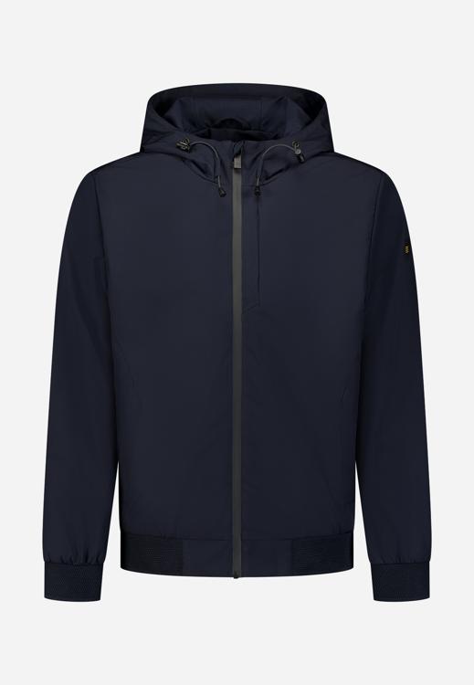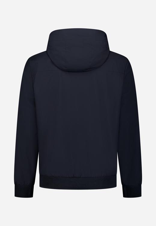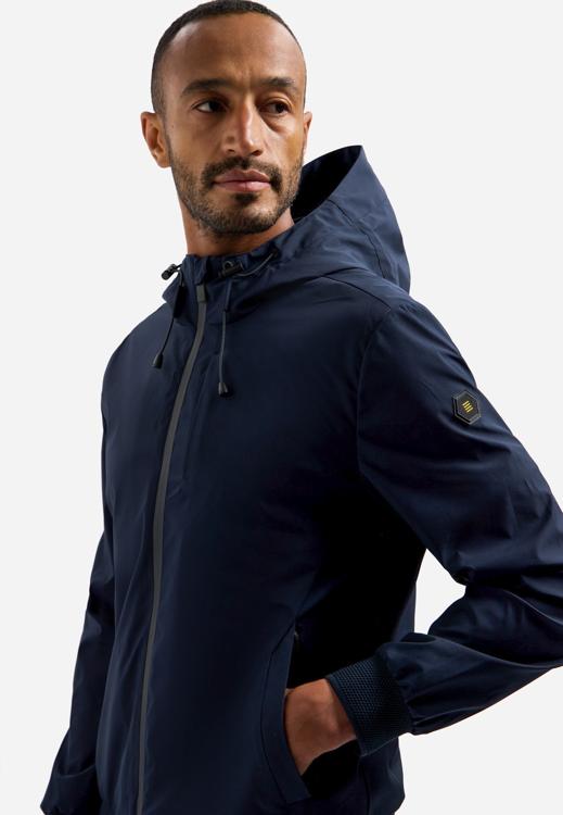 Een donkerblauwe softshell jack van No Excess die strak en clean oogt. De capuchon is voorzien van een trekkoord, de volledige rits loopt tot aan de kin en de geribbelde manchetten zorgen voor een nette afwerking. Het stretch materiaal zit soepel en beweegt mee zonder te knellen. Een subtiel merkbadge op de mouw completeert de look. Dit is een veelzijdige herenjack voor het voorjaar en zomer seizoen 2026.