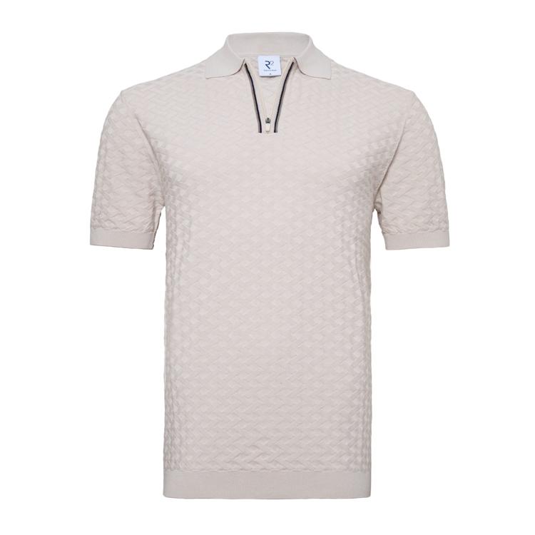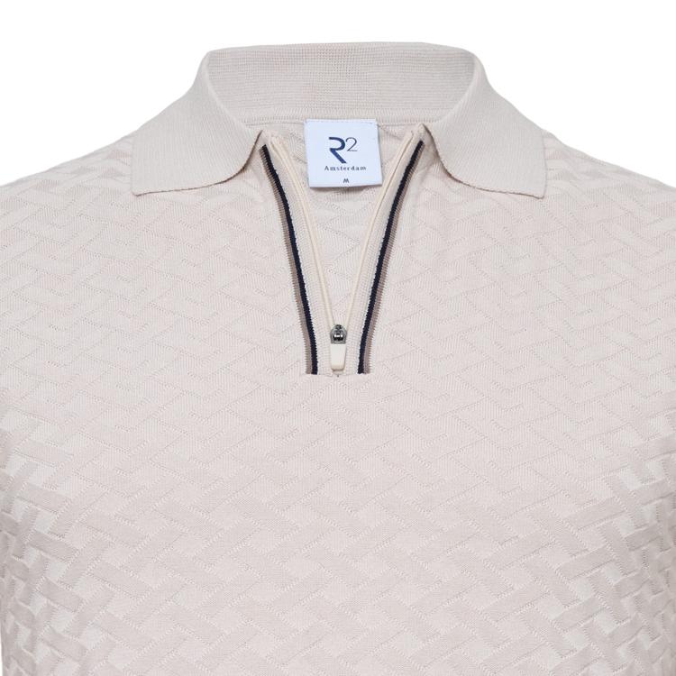 Deze beige heren polo van R2 Amsterdam heeft een fijn ruitdessin in het breisel en een klassieke polokraag. De halssluiting is een korte knoopsluiting met een donkere biesdetaillering, wat de polo een subtiel accent geeft. De korte mouwen en geribde boordafwerking geven het stuk een strakke, verzorgde uitstraling. Door de combinatie van katoen en modal draagt deze heren polo zacht en aangenaam op de huid, ook op warme zomerdagen.