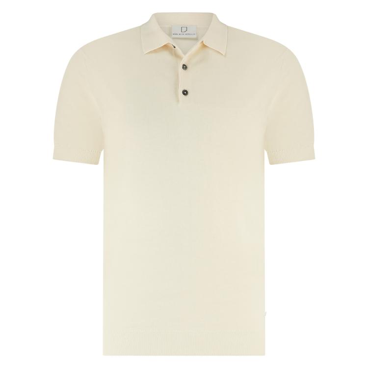 Een strakke off-white heren polo van Born with Appetite die er verzorgd uitziet zonder formeel te worden. De polo heeft een klassieke polokraag, korte mouwen en een knoopsluiting met drie donkere knoopjes die net dat subtiele detail geven. De mix van katoen, zijde en linnen zorgt voor een lichte, soepele stof die aangenaam aanvoelt op de huid en goed ademt op warmere dagen.
