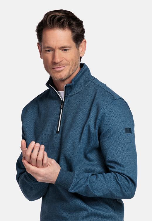 Deze blauwe half-zip sweater van Baileys combineert een strakke, verzorgde uitstraling met het draagcomfort van puur katoen. De stof voelt zacht aan, ademt goed en houdt zijn vorm na herhaaldelijk wassen. De half-zip sluiting aan de voorkant zorgt voor eenvoudige ventilatie. Het Baileys-embleem op de mouw en de ribgebreide boorden en manchetten geven de trui een afgewerkte, sportief-klassieke look.