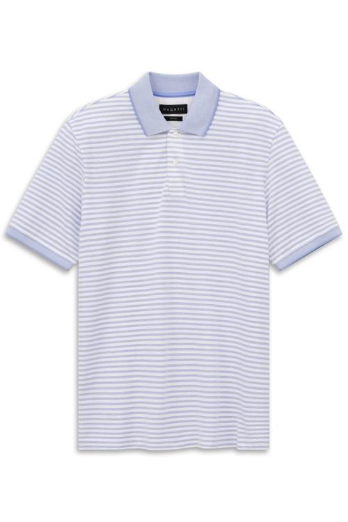 Deze heren polo van Bugatti combineert een klassiek gestreept dessin in lichtblauw en wit met een aangenaam draaggevoel de hele dag door. De polokraag en korte mouwen met geribbelde boorden geven het shirt een verzorgde uitstraling. Verkrijgbaar bij Lodewijk Mannen, dit is een veelzijdige polo voor heren die comfort en stijl op één lijn willen houden. De lichte, ademende stofsamenstelling maakt dit shirt geschikt voor warme zomerdagen.